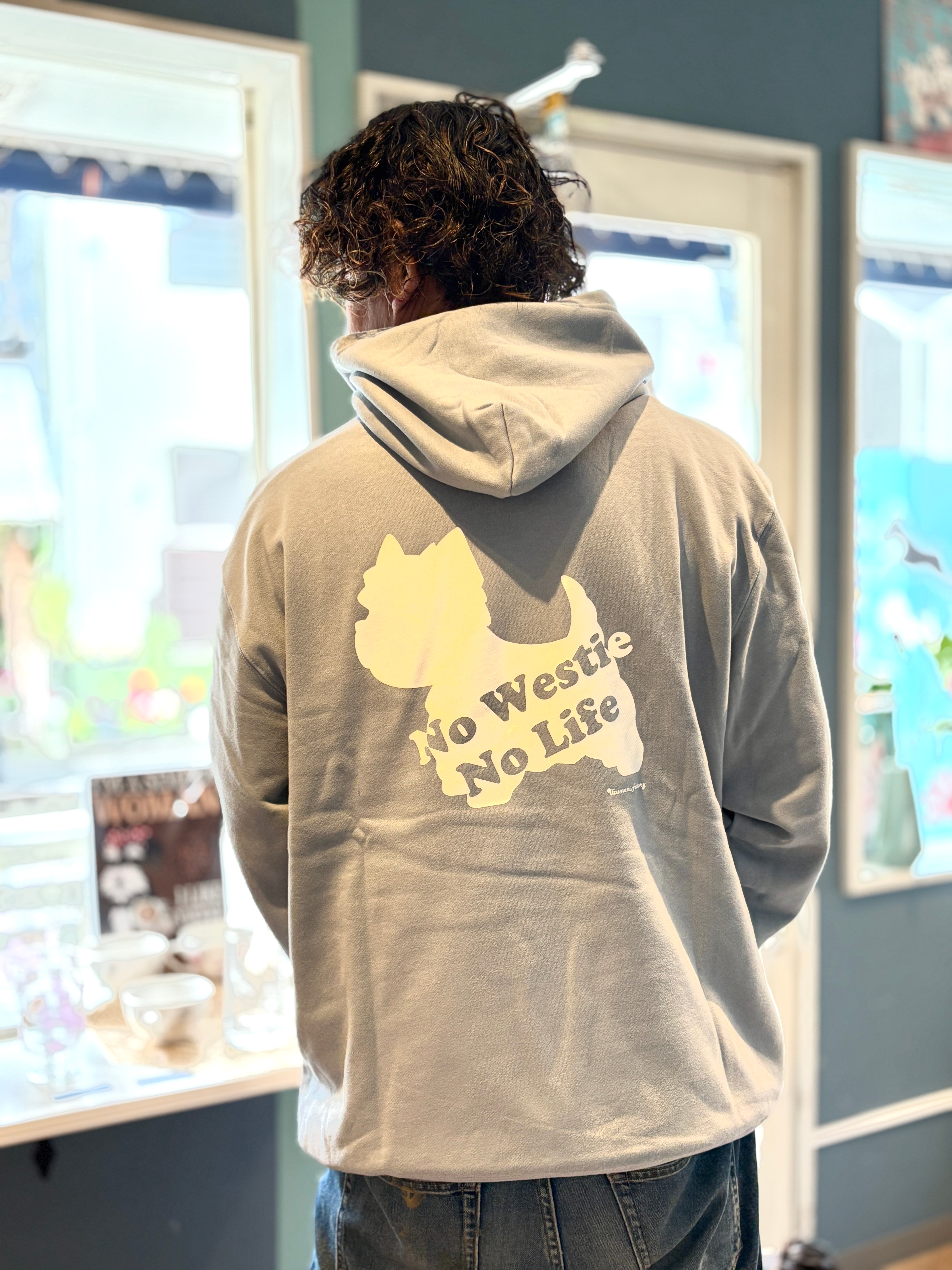 うずまきファクトリーの【No Westie No Life】オリジナルウエスティロゴが背面にデザインされた、裏パイル地のパーカーです。