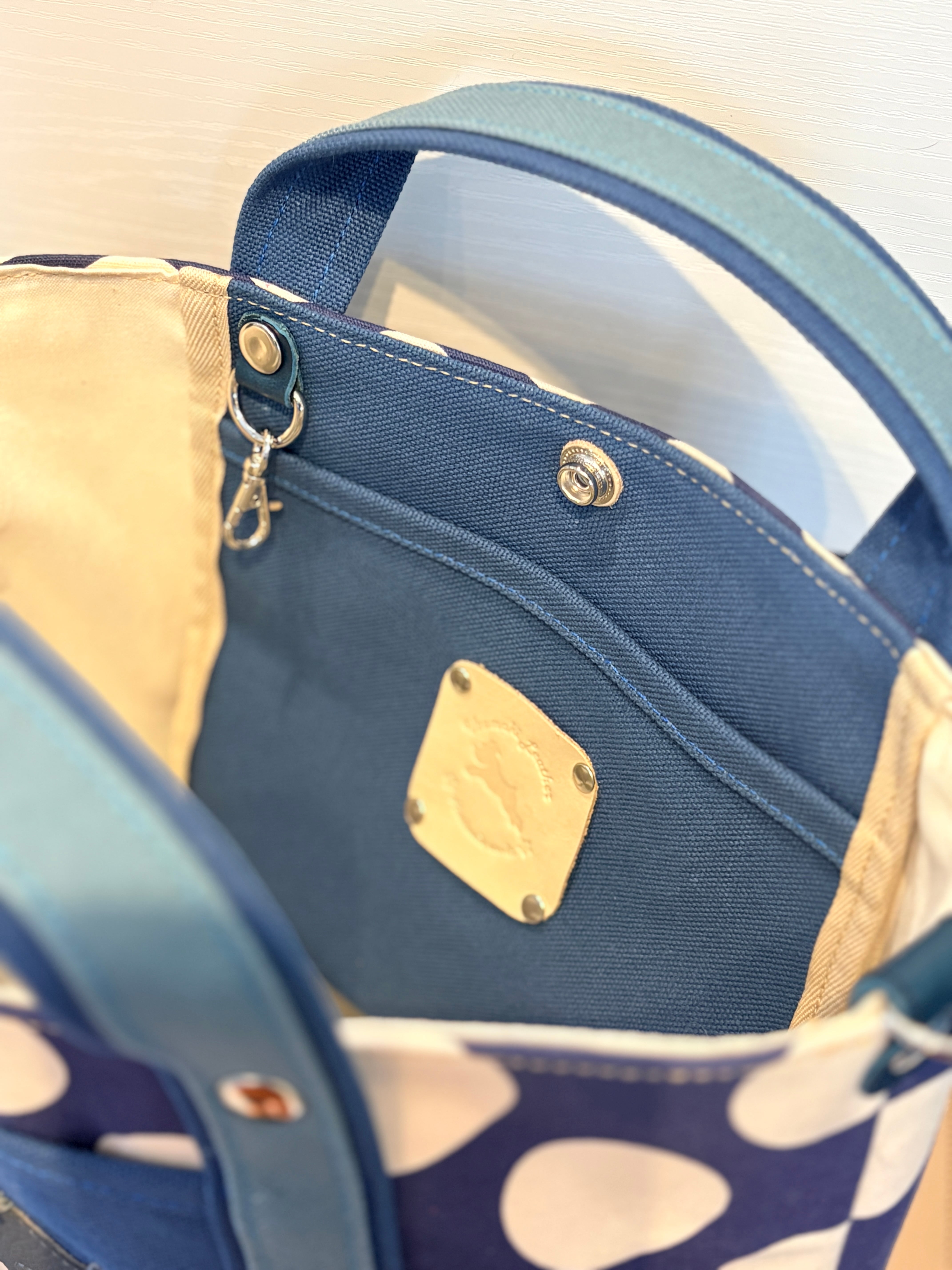 ネイビーに白の水玉とくすみ系のレインブルーを使ったトートバッグです。(写真3枚目と4枚目が実物に近い色味になります)