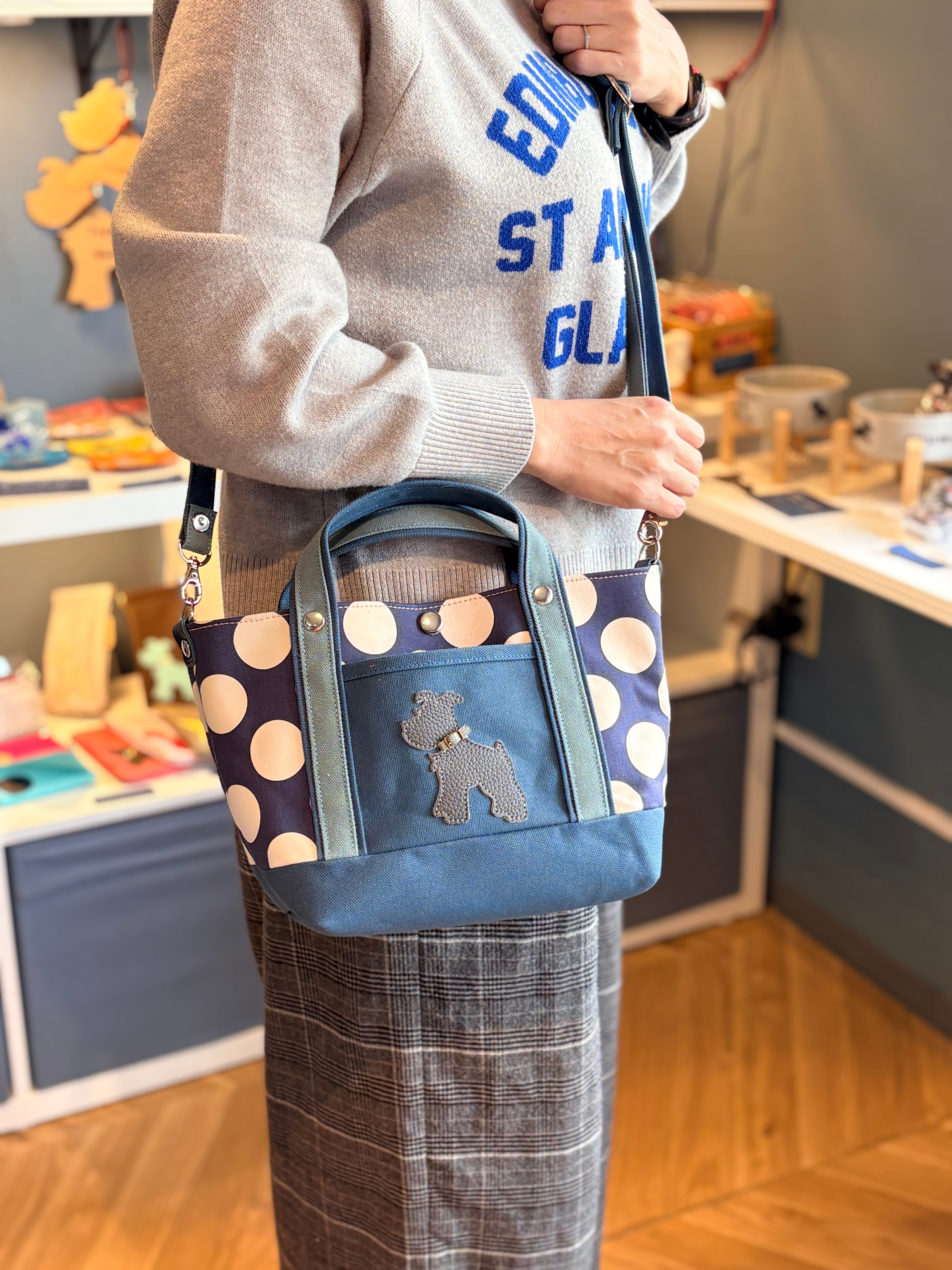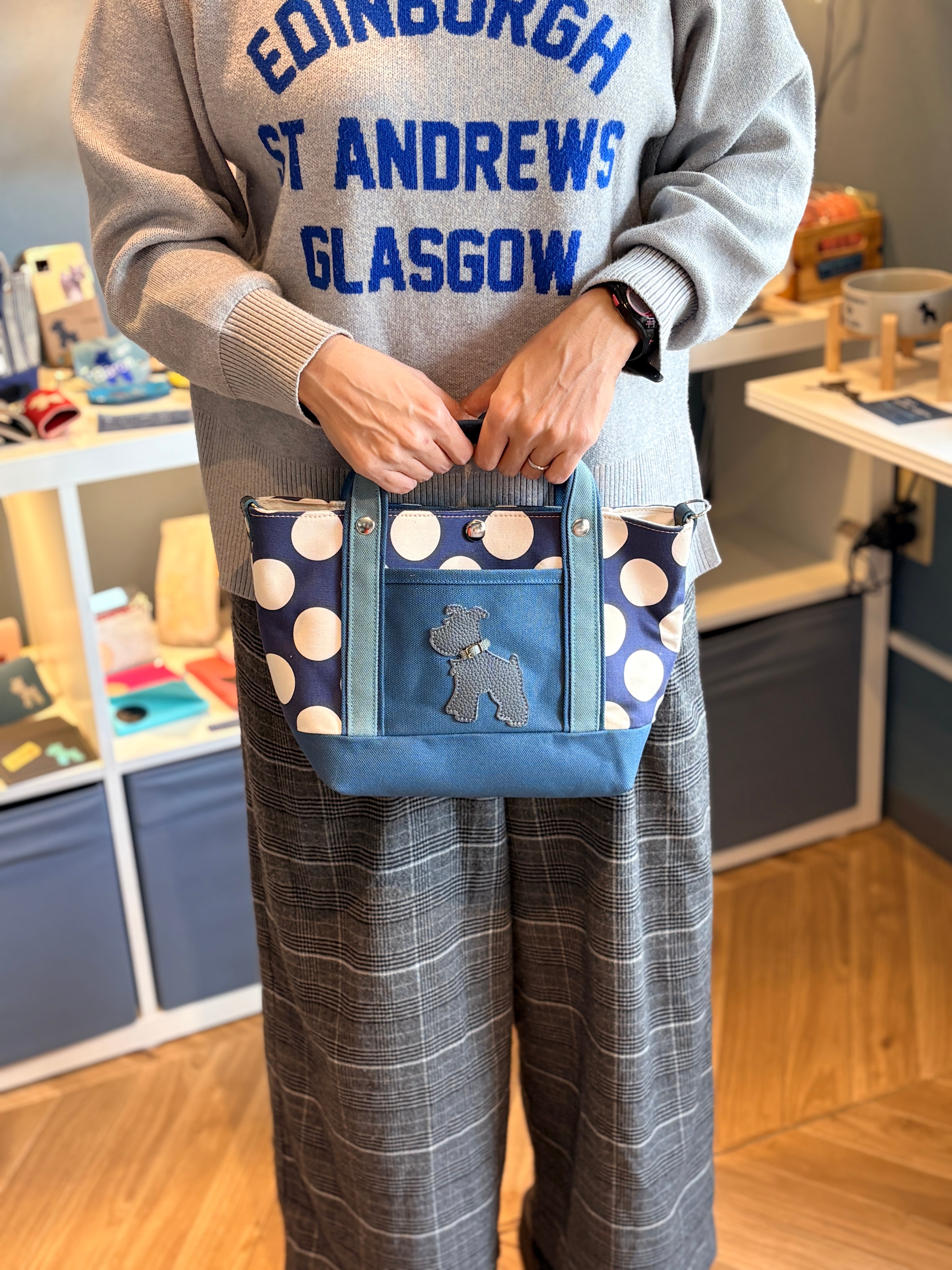 中トートバッグ ★ネイビー水玉✖レインブルー 立ちシュナ:グレー 中布:ホワイト
