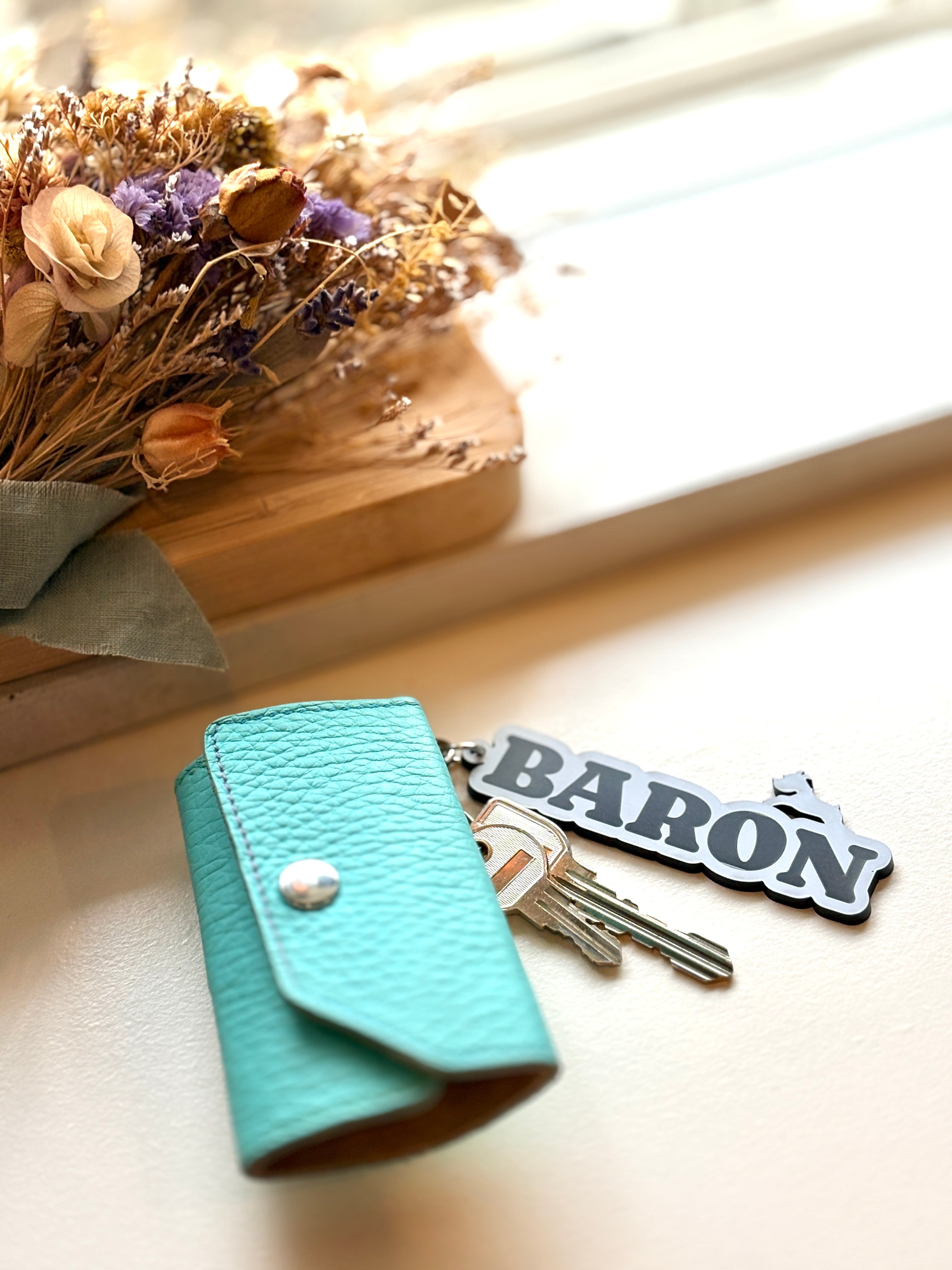 愛犬のお名前をスタイリッシュに持ち歩けるキーホルダーです。