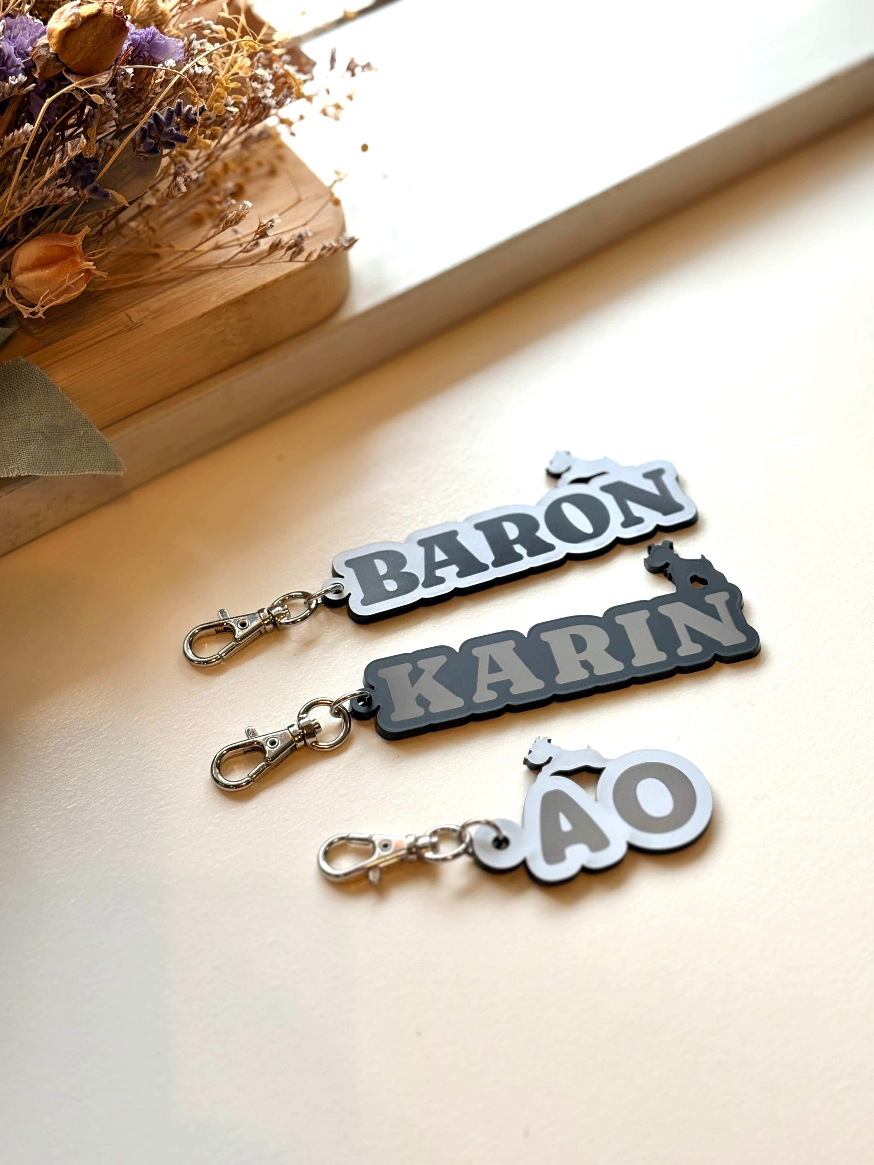 お散歩バッグやキーリングに付けて、愛犬の名前をいつでもおしゃれに楽しむことができます。