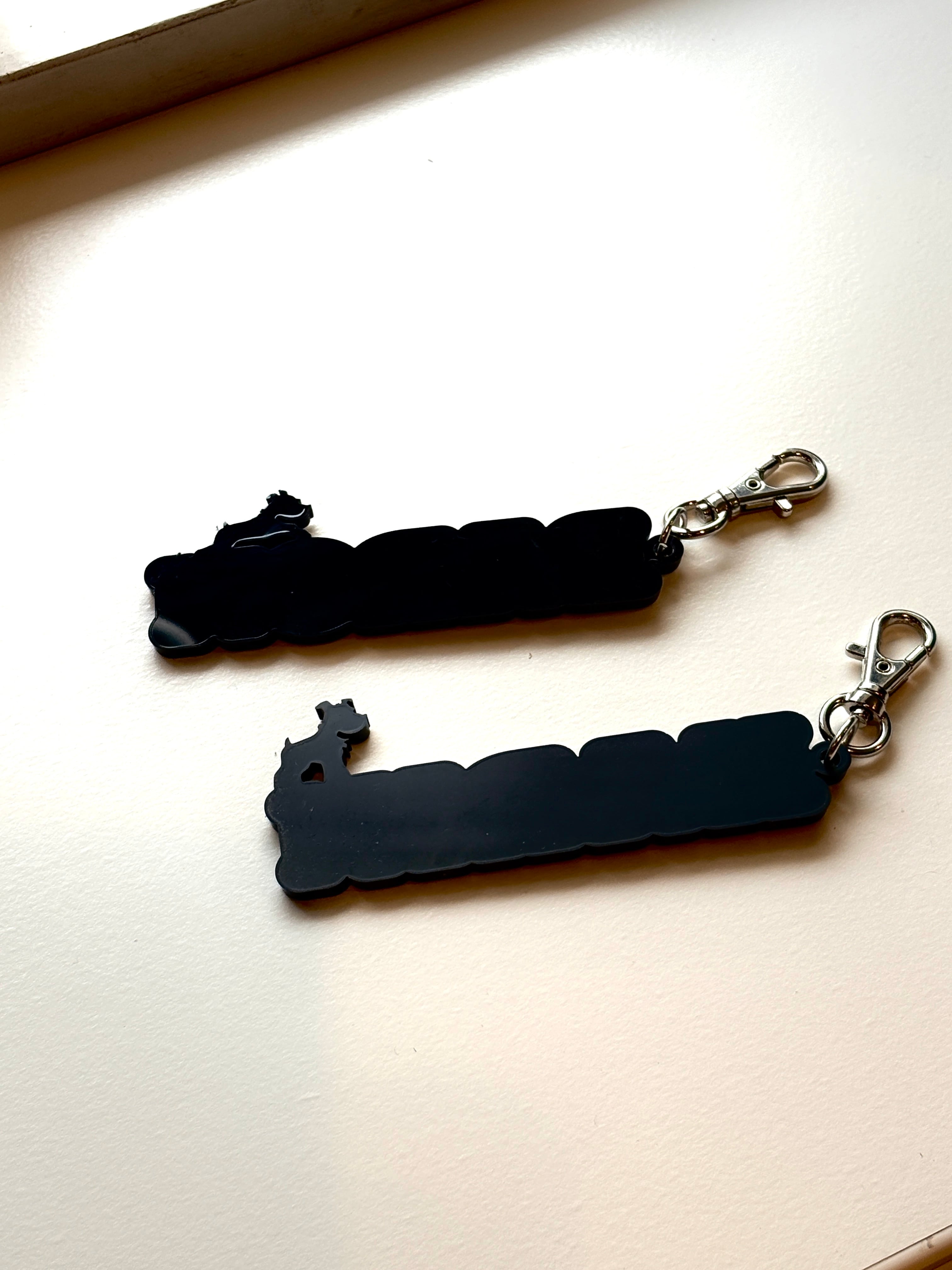 アクリル製のキーホルダーに、愛犬のお名前を大文字アルファベットでレーザー彫刻いたします。(現在アルファベット大文字のみとなります)