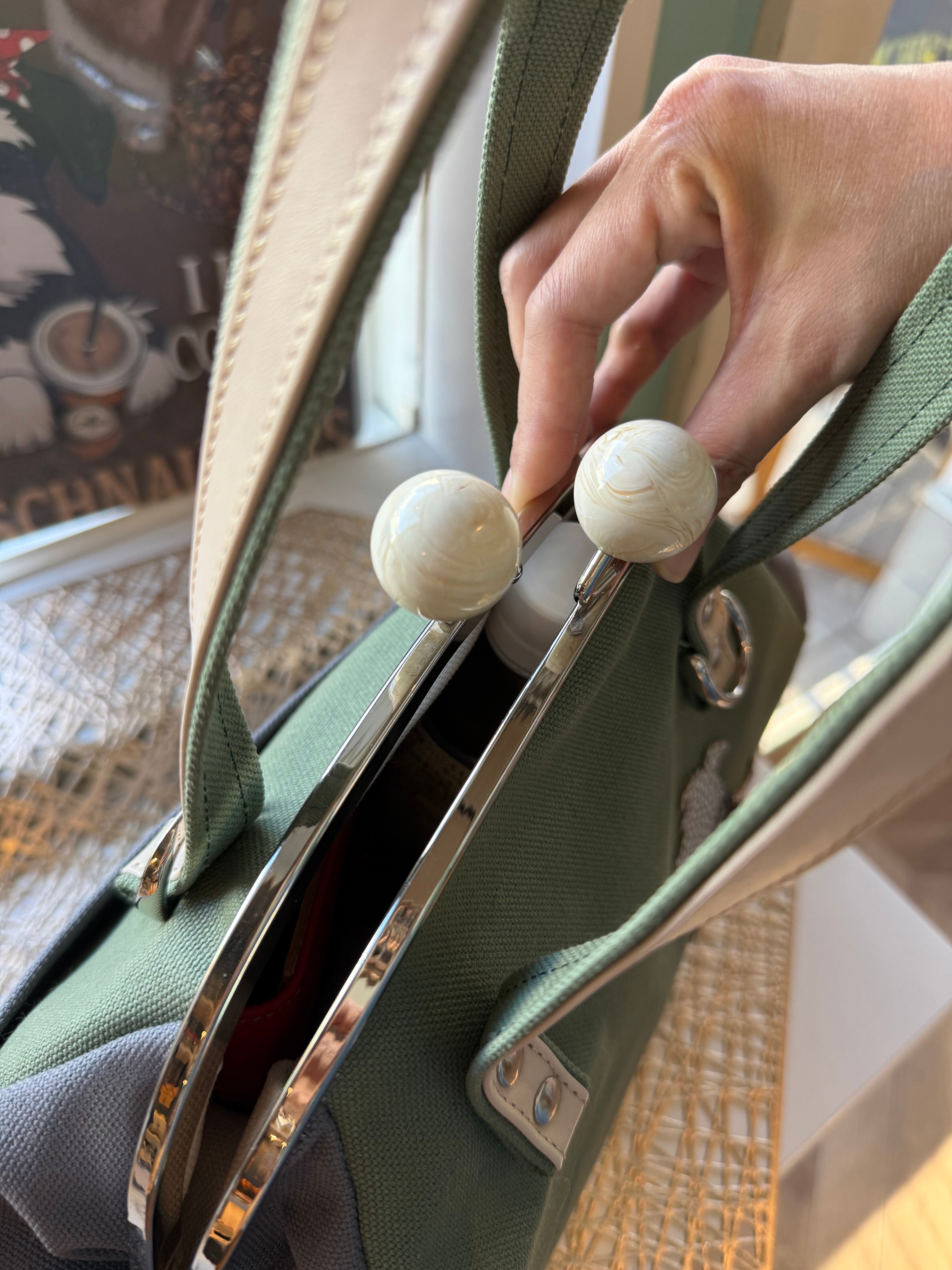 肩掛け時に邪魔になりづらいように持ち手は短めにしてます。
