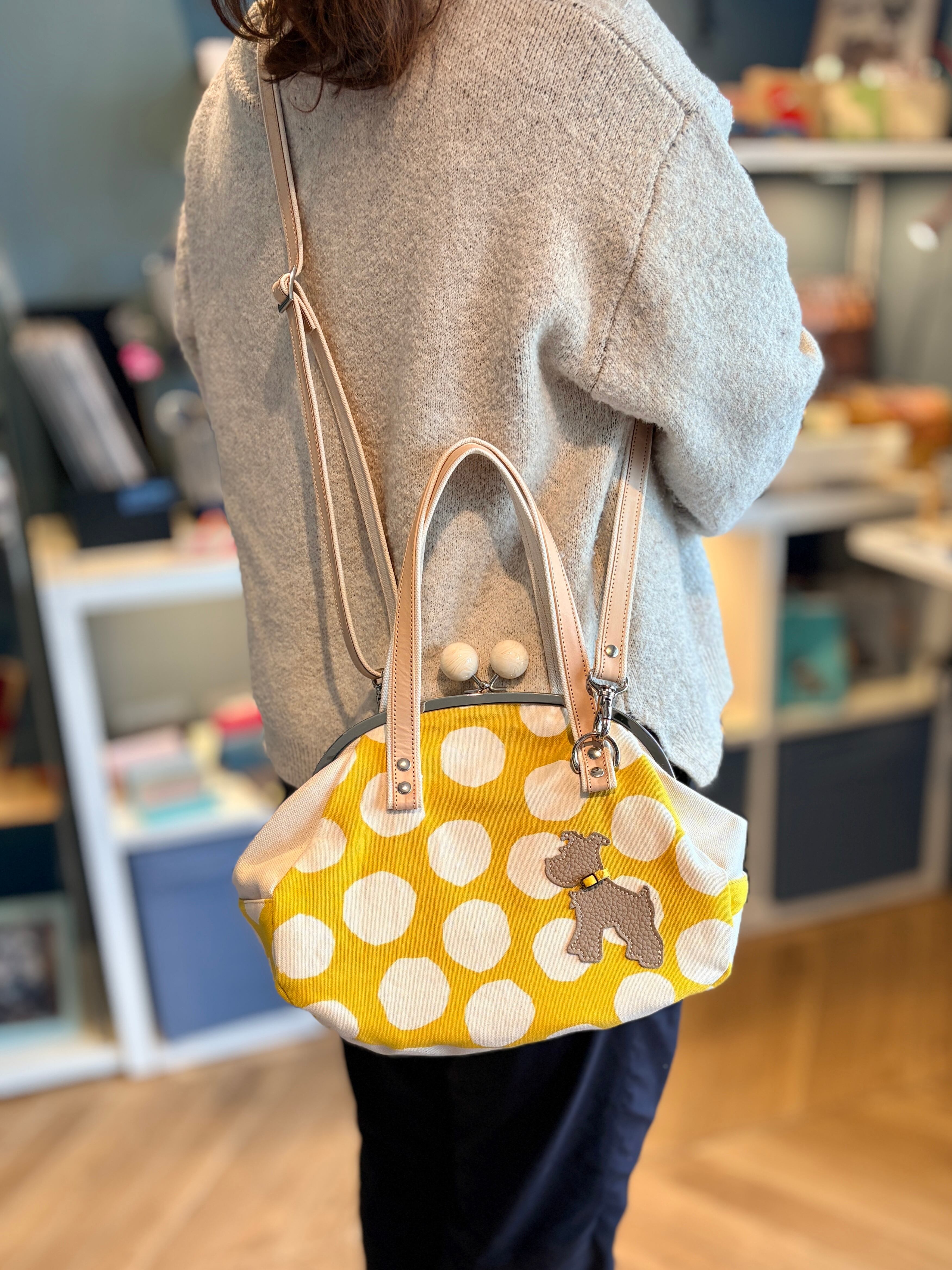 がま口バッグ 背面ポケット付き 本体:イエローに白水玉×グレー 立ちシュナ:グレー ひねり玉:ホワイト